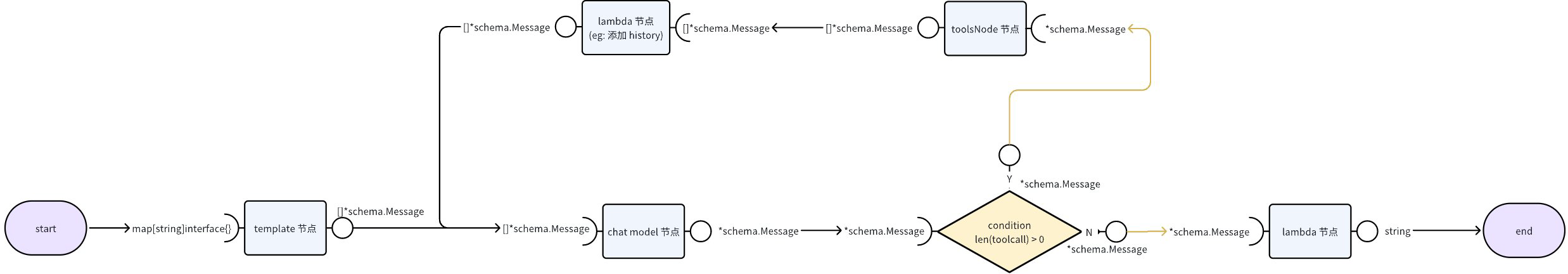 **Eino compose**:基于Graph模型(node+edge)compose components + 上下游node对流动的数据类型对齐为基础 的compose解决方案**。**