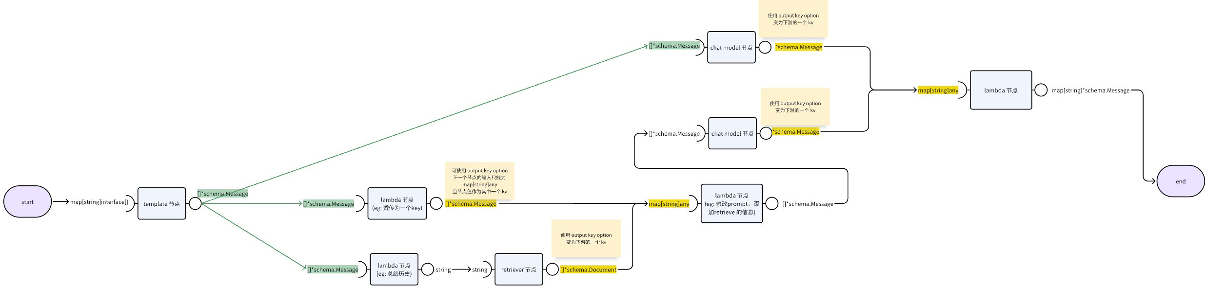 graph.AddXXXNode(node_key, xxx, compose.WithOutputKey("outkey"): 类型转化为 map[string]any。其中map 的 key 是 option 中指定的 OutputKey。一般用于多条边汇聚到某一个节点时。