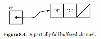 - 通道的零值nil通道有时候很有用:因为在nil通道上发送和接收将永远阻塞,对于select语句中的情况,如果其通道是nil,它将永远不会被选择。这次让我们用nil来开启或禁用特性所对应的情况,比如超时处理或者取消操作,响应其他的输入事件或者发送事件。