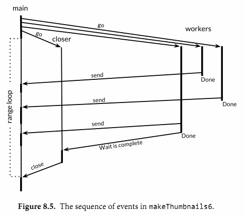 考虑替代方案:如果我们将等待操作放在循环之前的main goroutine中,因为通道会满,它将永不结束;如果放在循环后面,它将不可达,因为没有任何东西可用来关闭通道,循环可能永不结束;